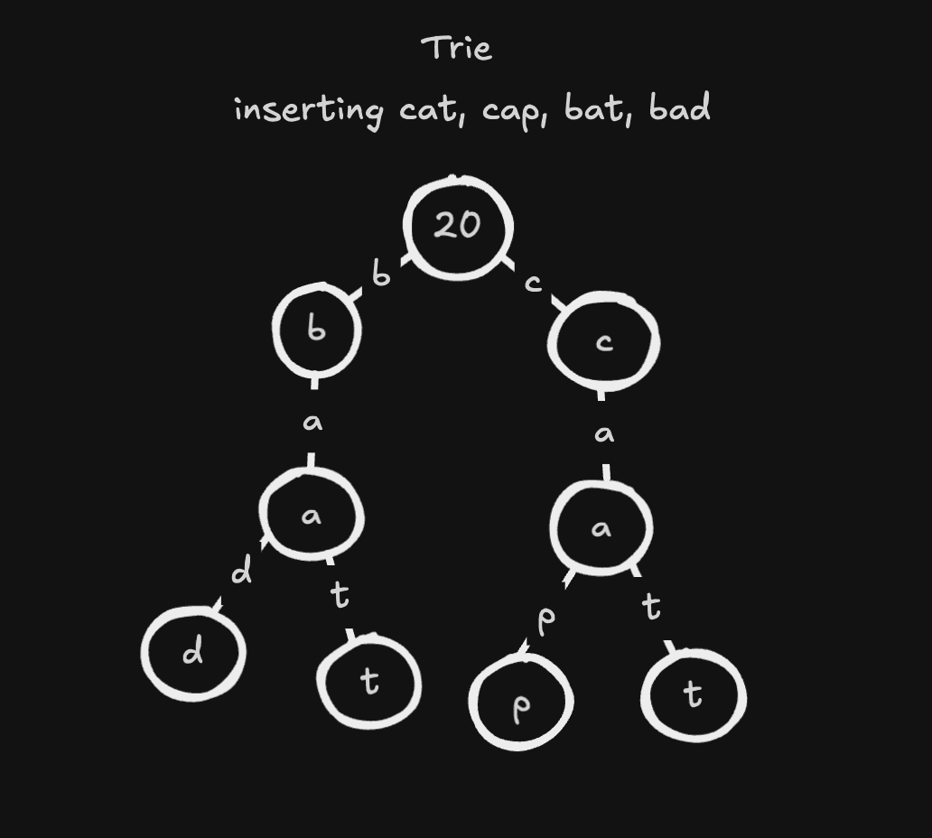 Here’s an example of how the Trie looks after inserting the words: cat, cap, bat, and bad.